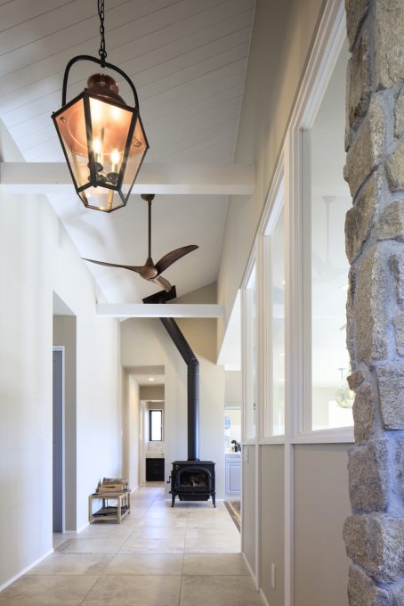 お洒落な照明と重厚感のある薪ストーブがお出迎え