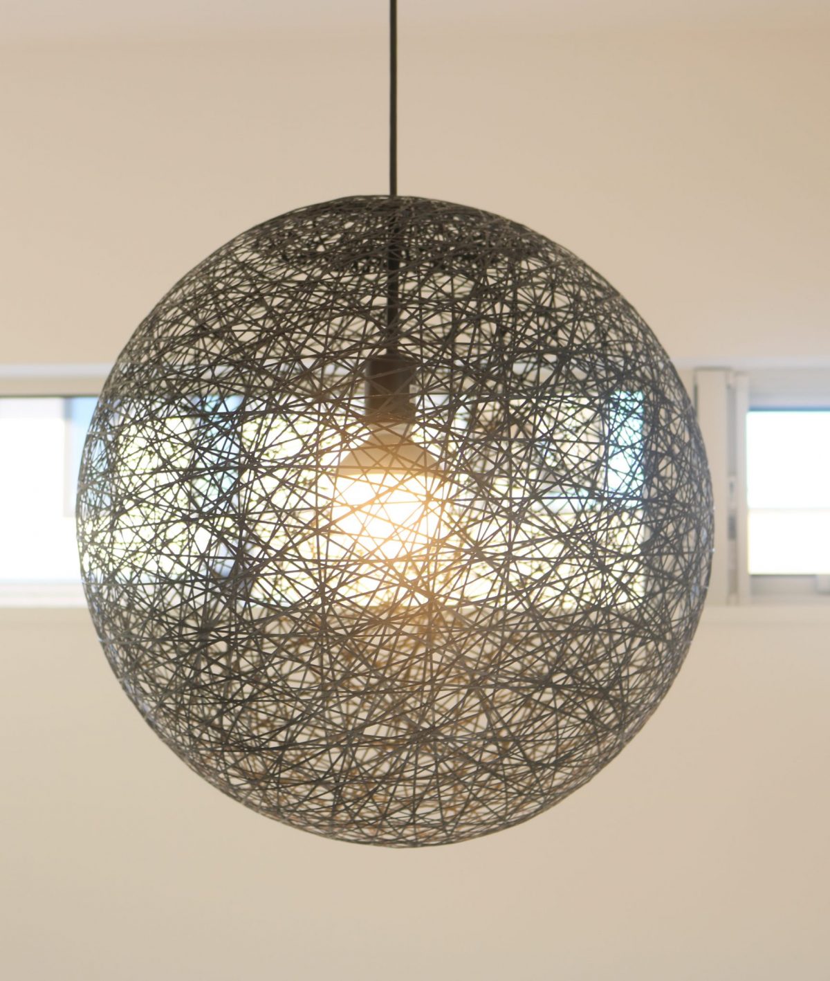 大きなガラスのランプシェードにダイニングテーブル、チェア、キッチン