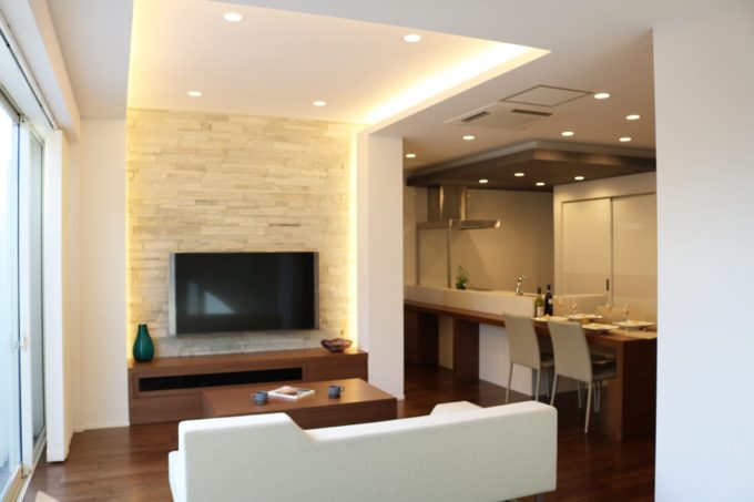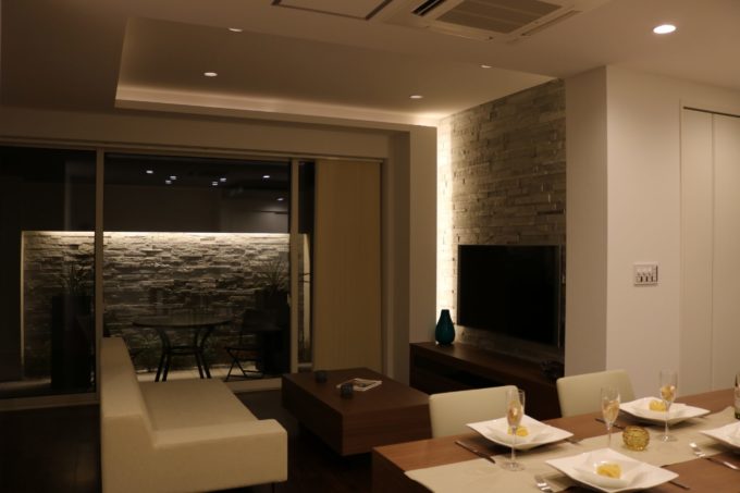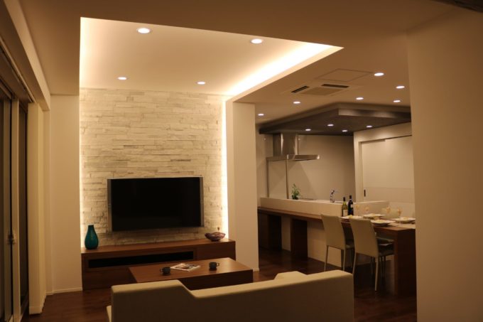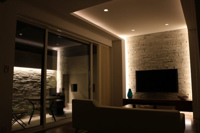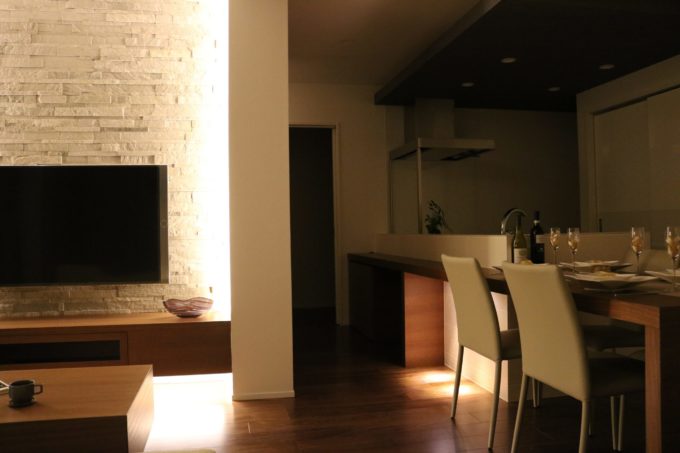 つづいてリビングもまたメイン壁の両サイドから天井までつづく間接照明が
