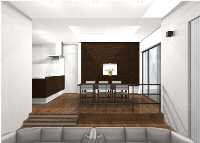 リビングからダイニングキッチンへは段差を設けることで