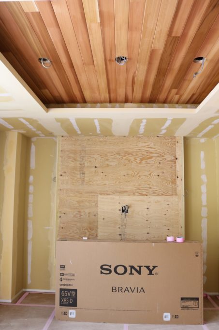 中央部分は細かい石張りとなり、壁掛けTVが施工されます💡