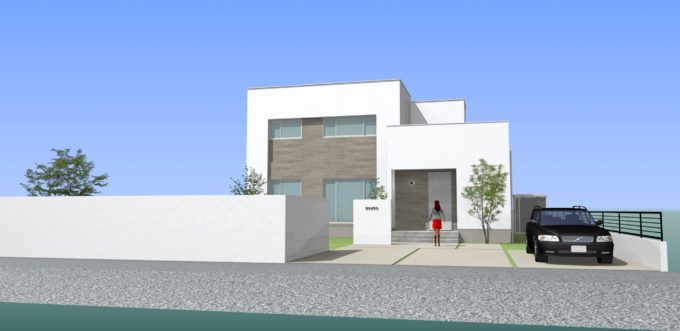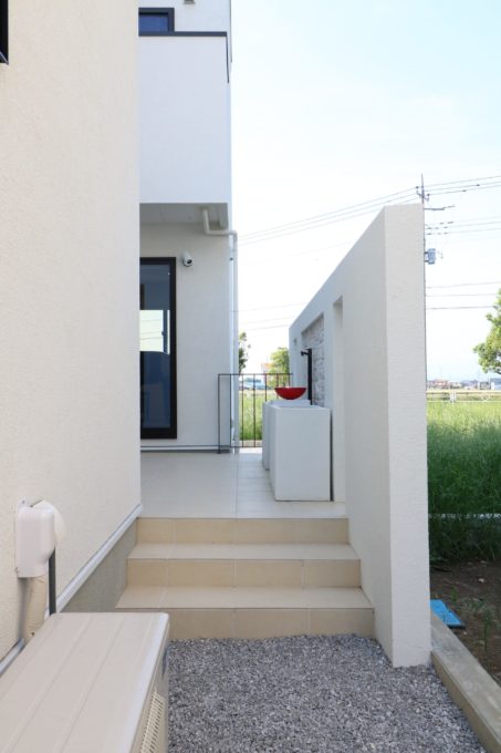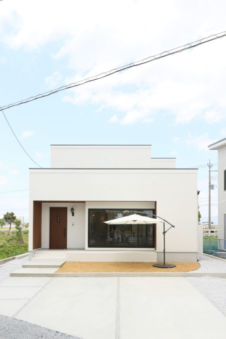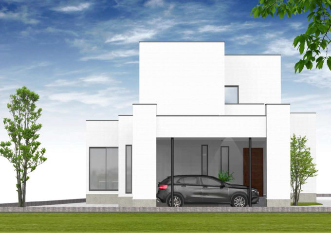 ホワイトの外壁にグレージュカラーがアクセントになり