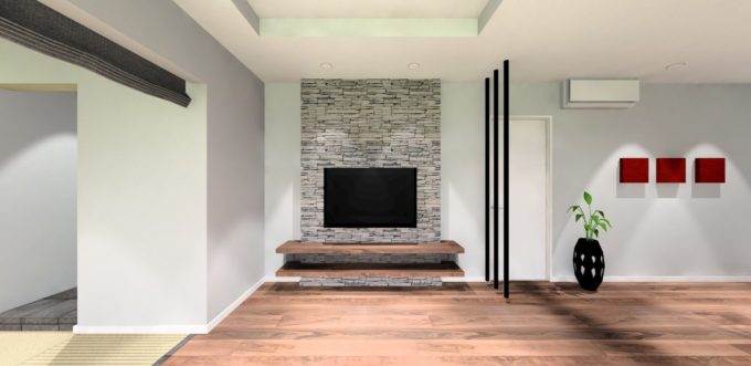 折り上げ天井に石張りのメイン壁・造作TVボード
