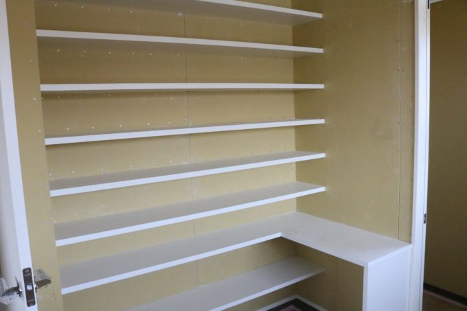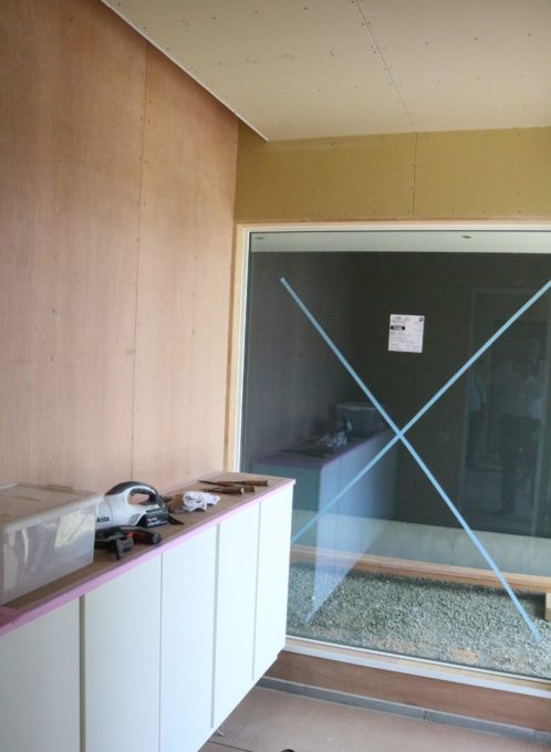 壁の手前にある造作カウンターをまさに今施工中