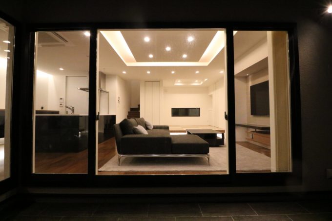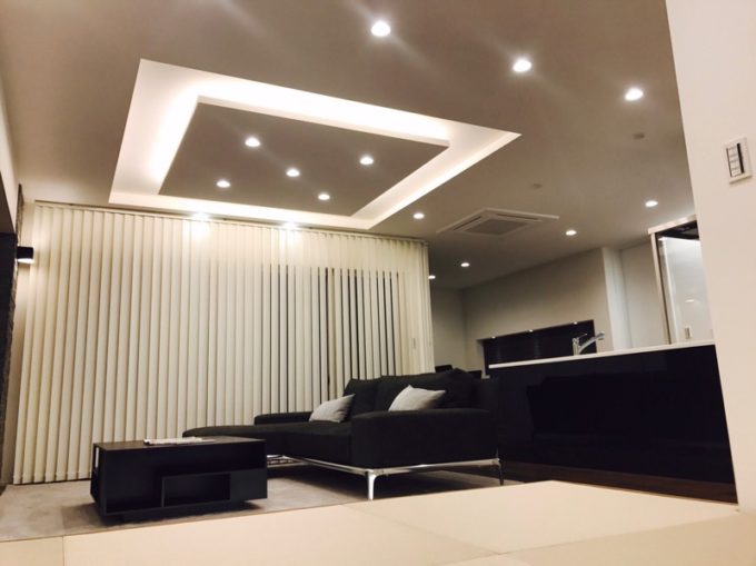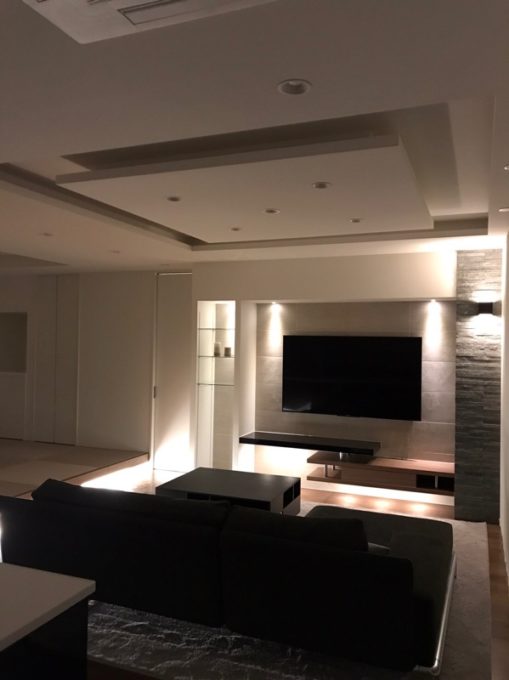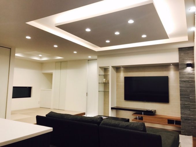 TVボード下のダウンライトや和室小上がり部分下の間接照明が