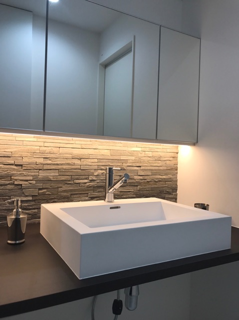 もう当たり前となっている洗面の石張り×間接照明ですが