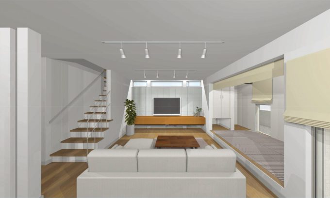 リビング、ダイニング、テラス、テラスの横の小上がりの畳スペース