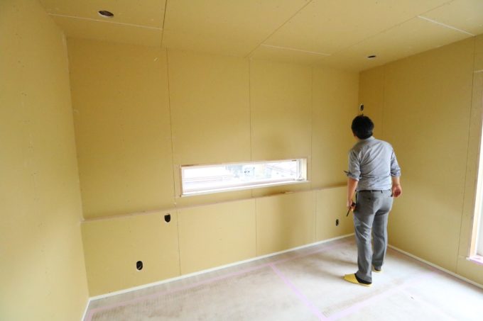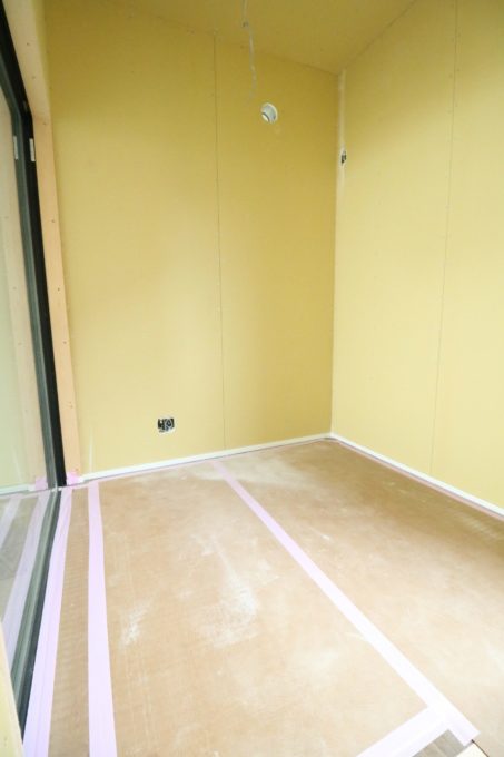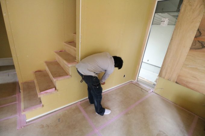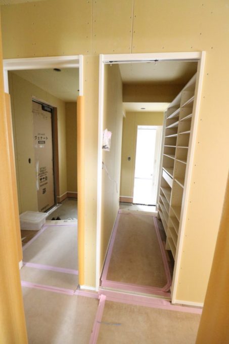 養生シートの下には落ち着いた色みの床材に、壁はホワイトのクロス