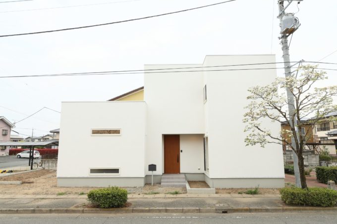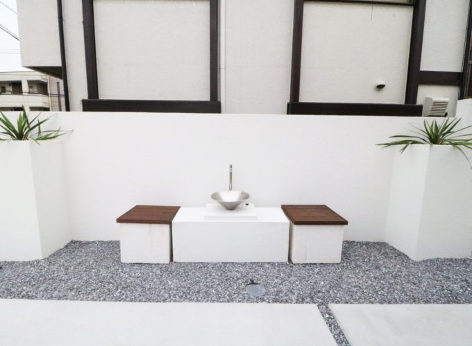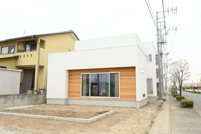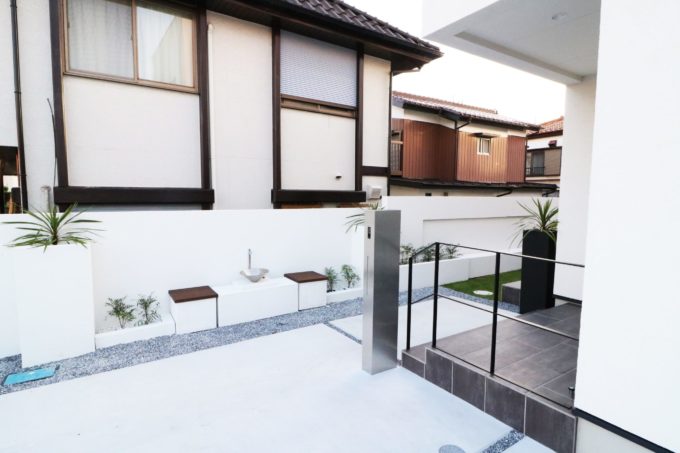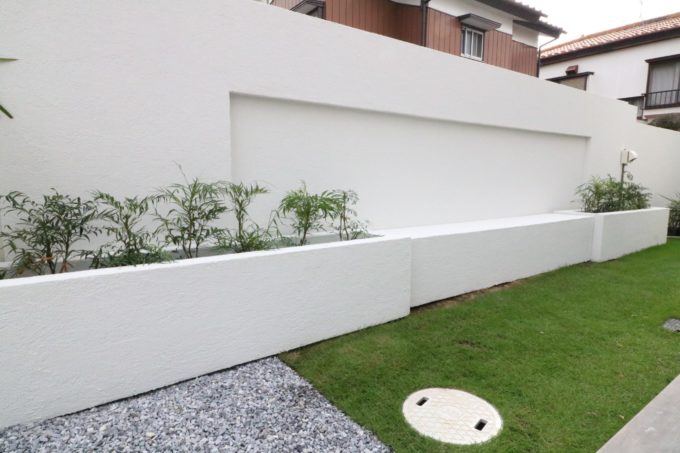 左側の近隣住宅との境目に白い塀と植栽BOXを施工しました🌿