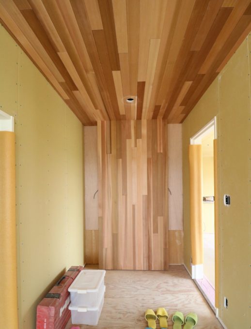 玄関ホールには室内用のレッドシダーを縦張りに💡