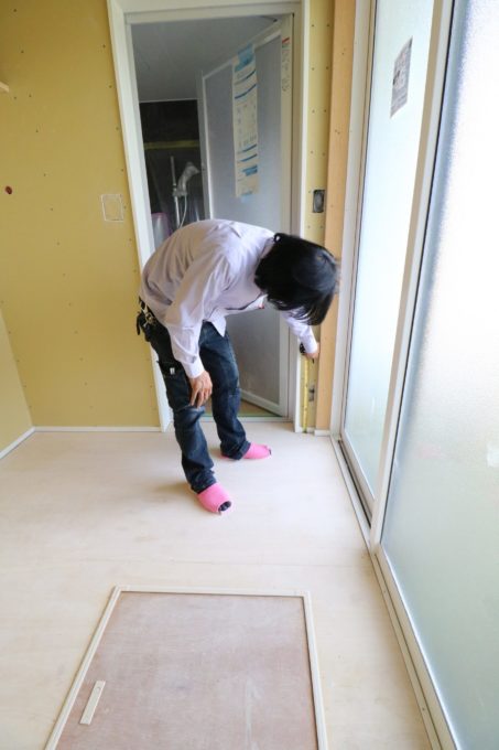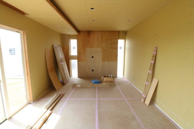 養生シートの下には重厚感のあるウォールナットの床材が隠れています💡