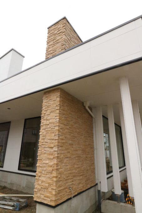 白い外壁にモザイク調の石張りと軒のレッドシダーが目をひきます!