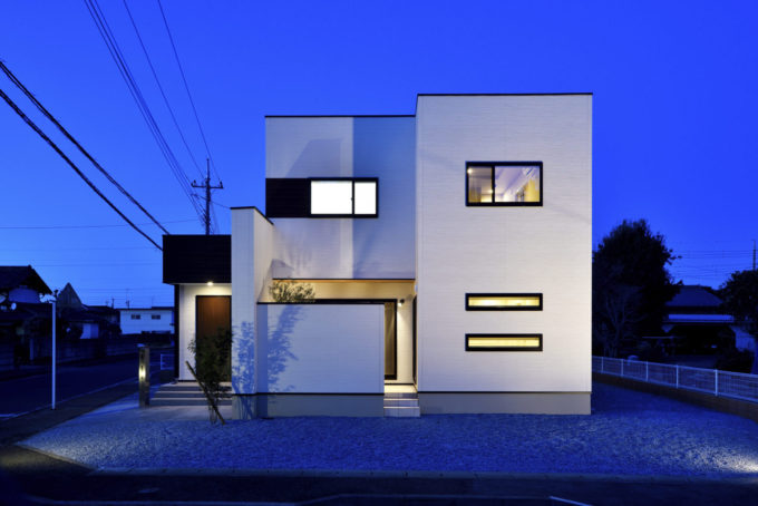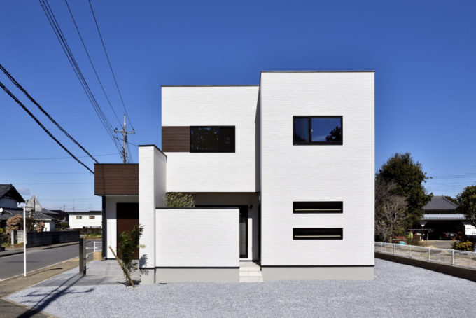 ホワイトの外壁に木目をアクセントに使い