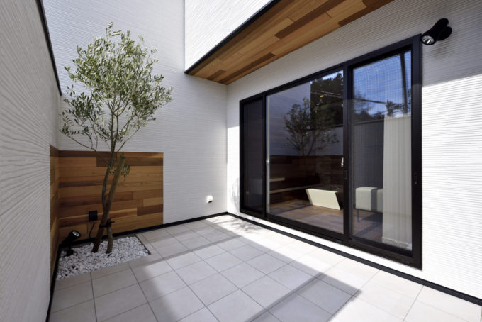外壁のホワイトとオリーブの緑を引き立てます🌿