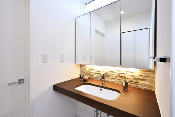 石張りに間接照明が美しい洗面スペース