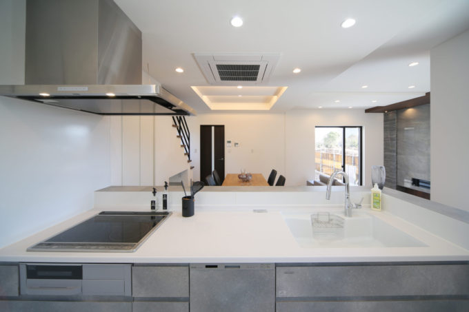 キッチンはコンクリート色を使いながらも