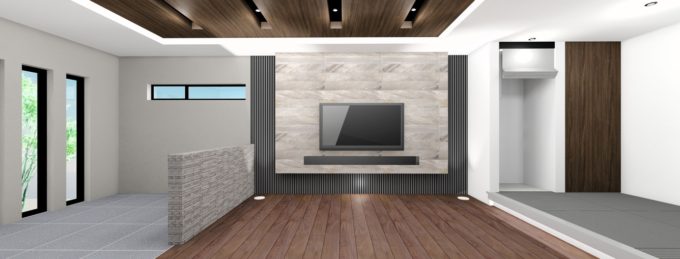 リビングではメインウォールのタイルや