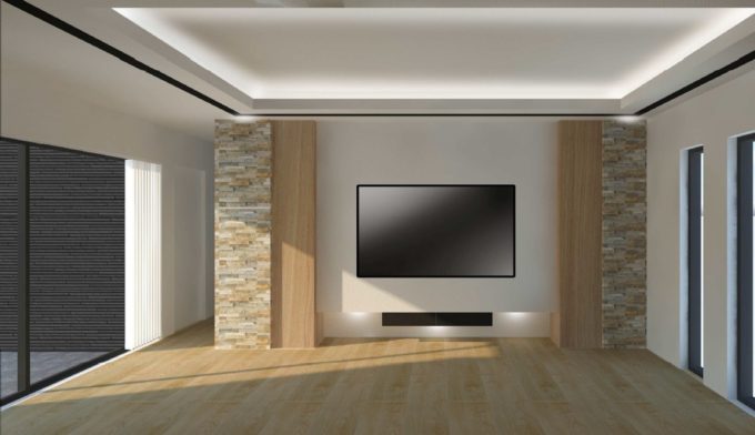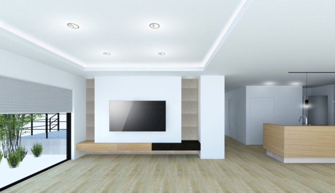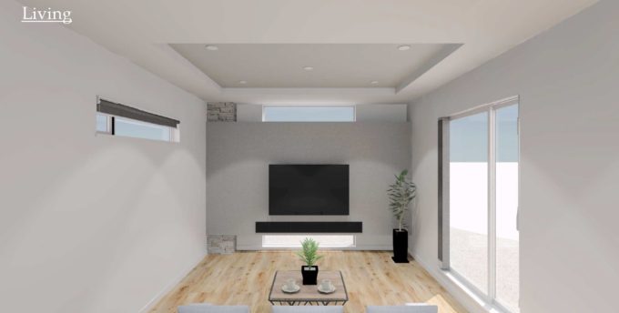 リビングは大きな窓と折り上げ天井で