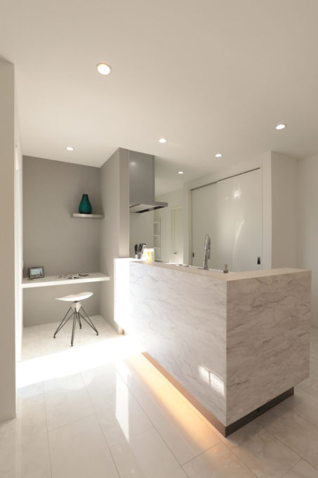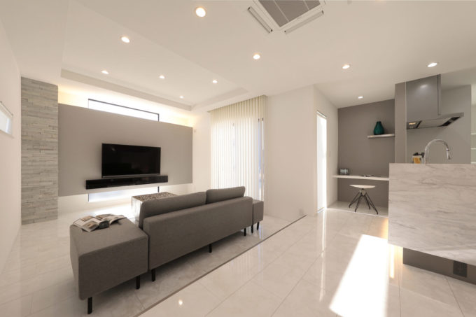 鏡面仕上げのホワイト石目柄とライトグレーの石張など