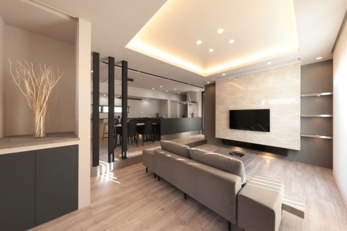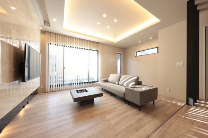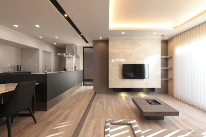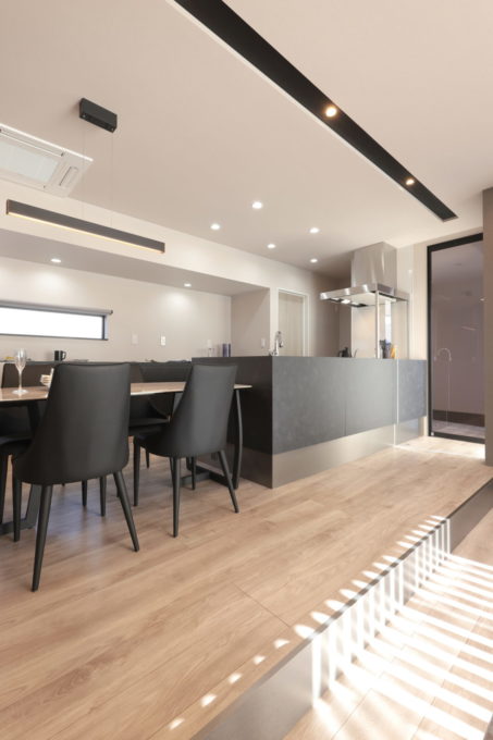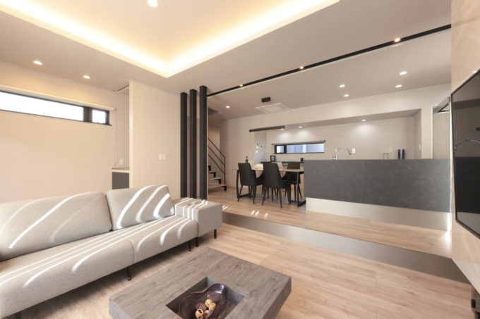リビングは、スキップフロアで一段下げ、