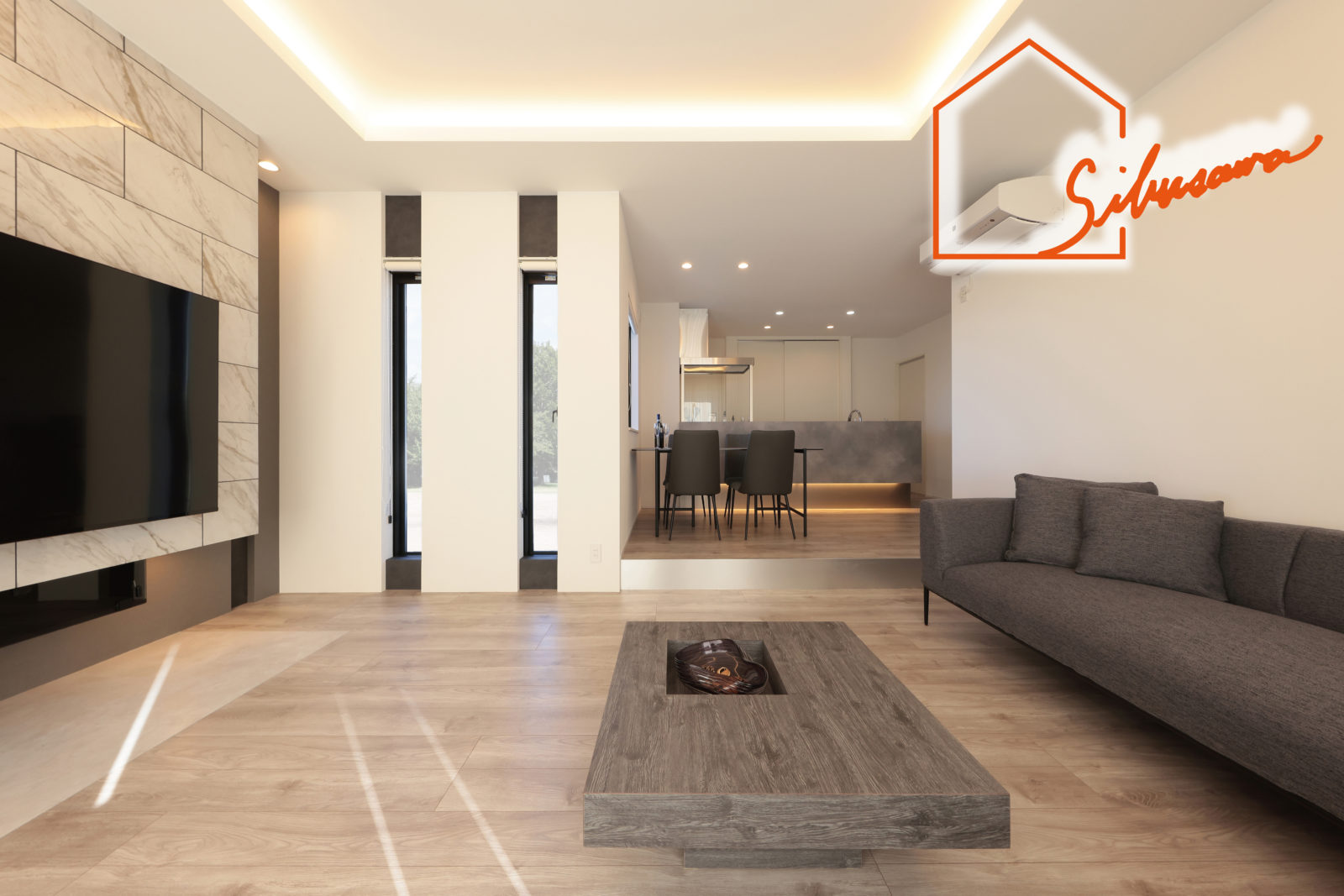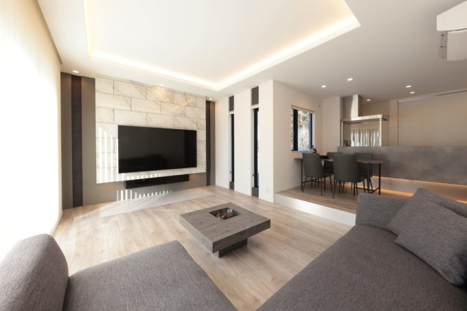 リビングは、スキップフロアで一段下げ、