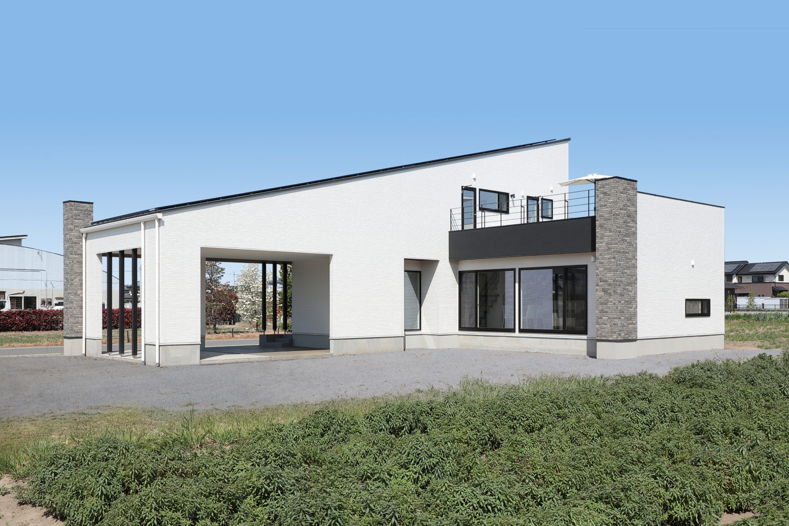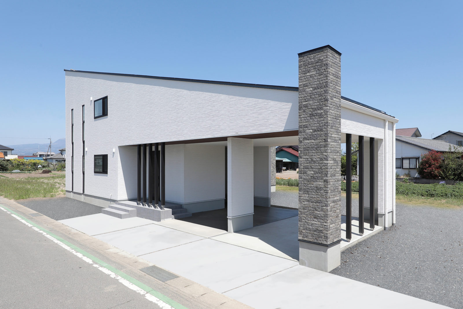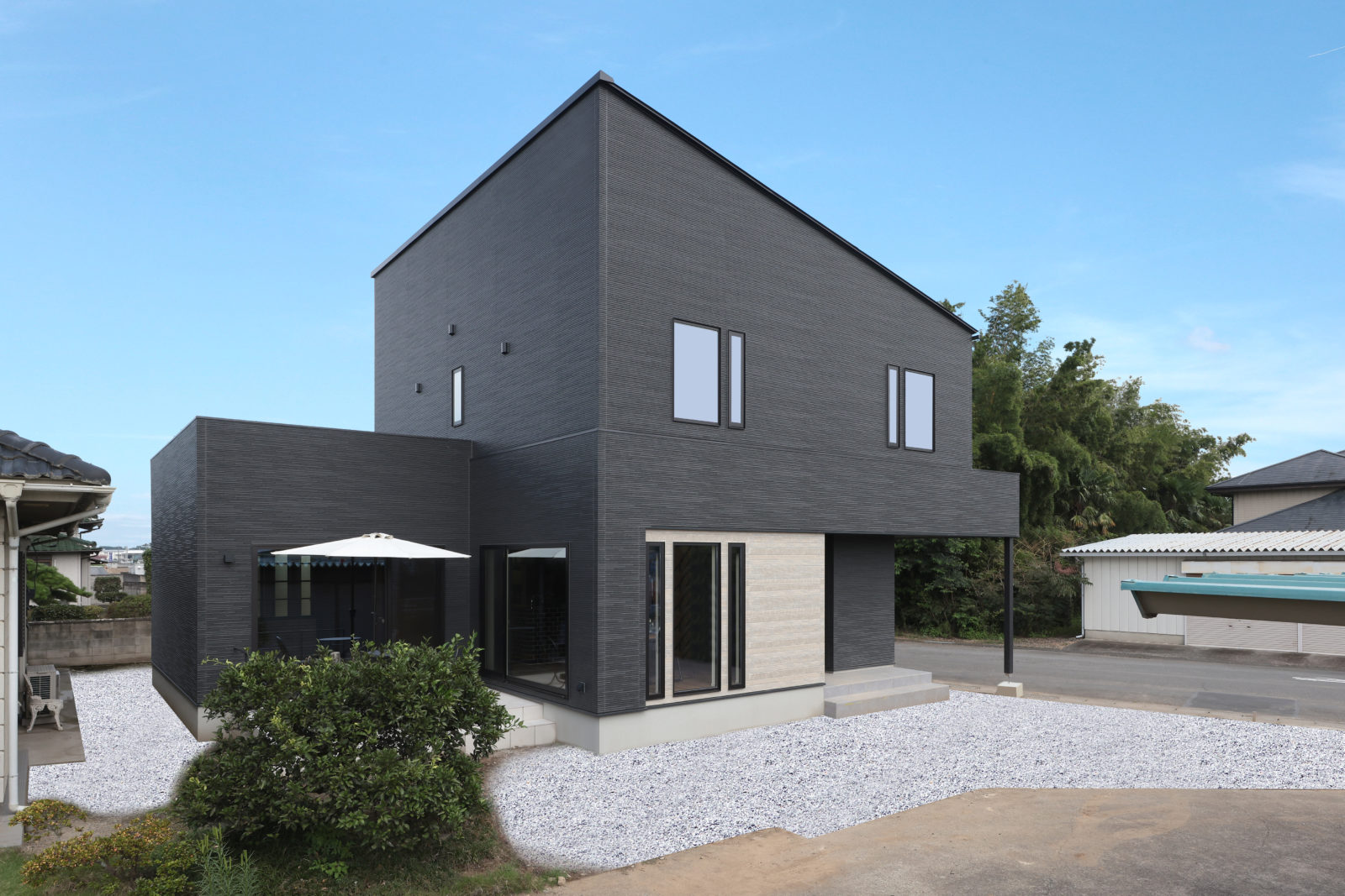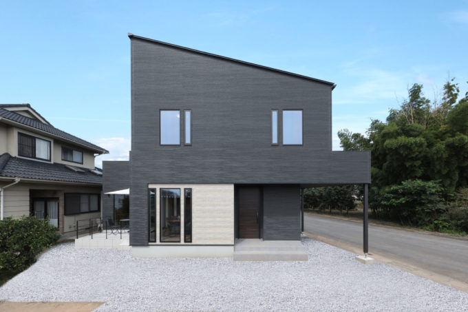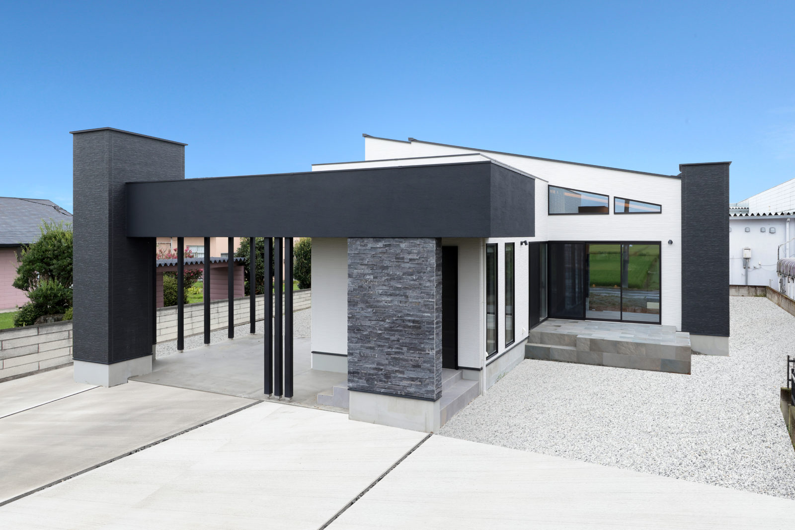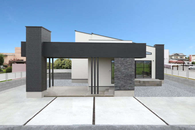 ガレージと片流れ屋根が印象的で迫力のある外観。