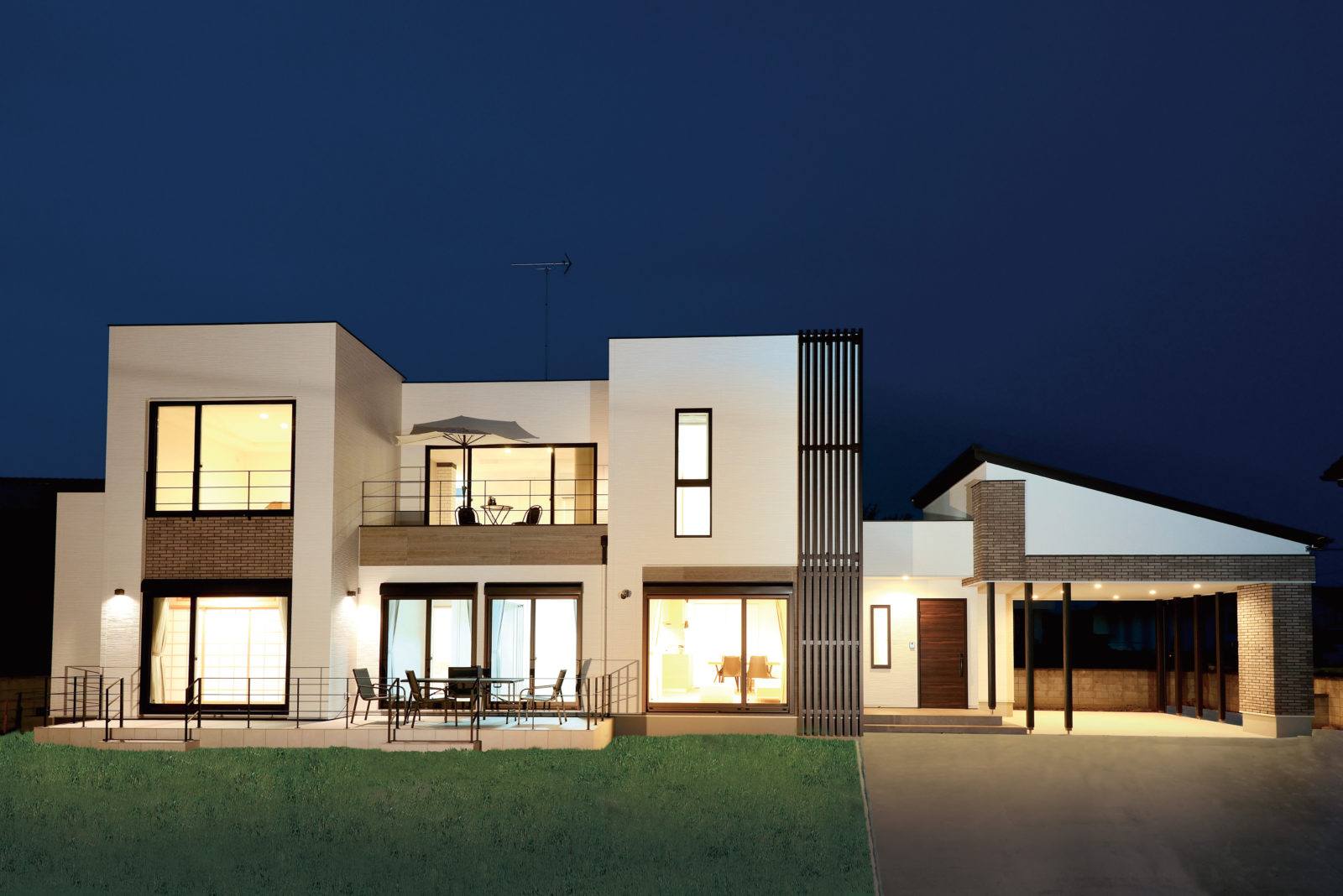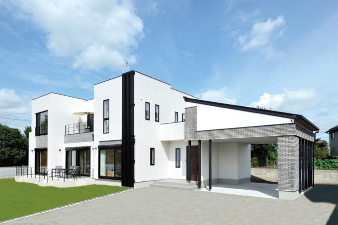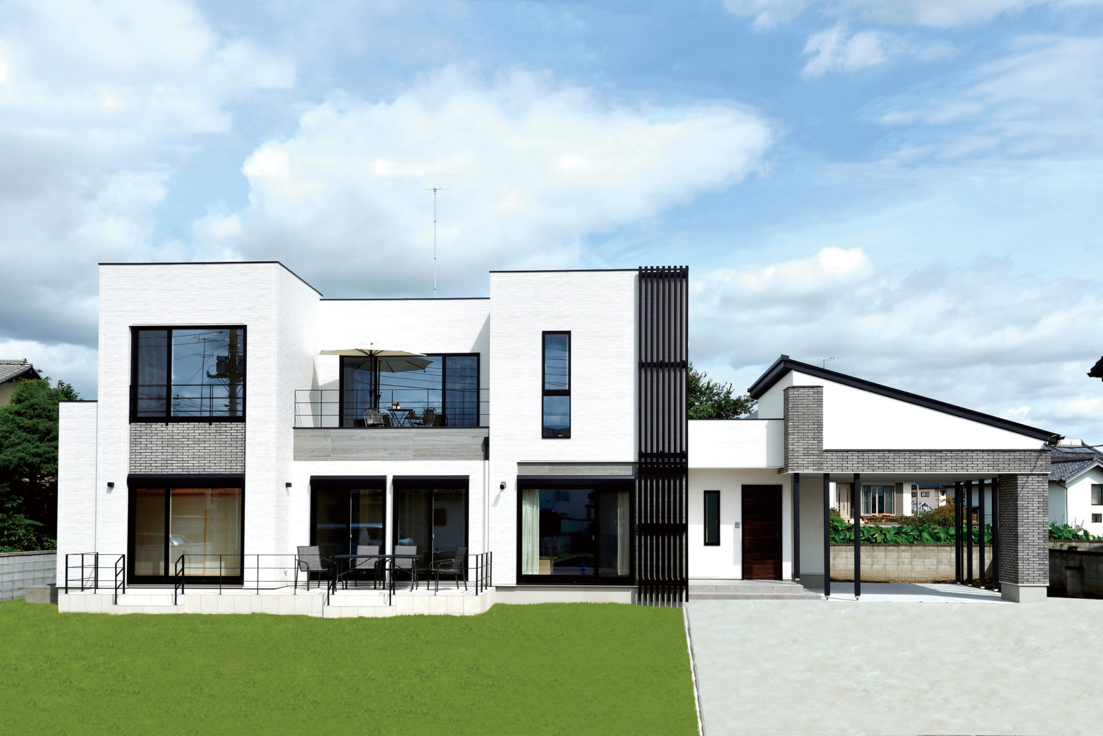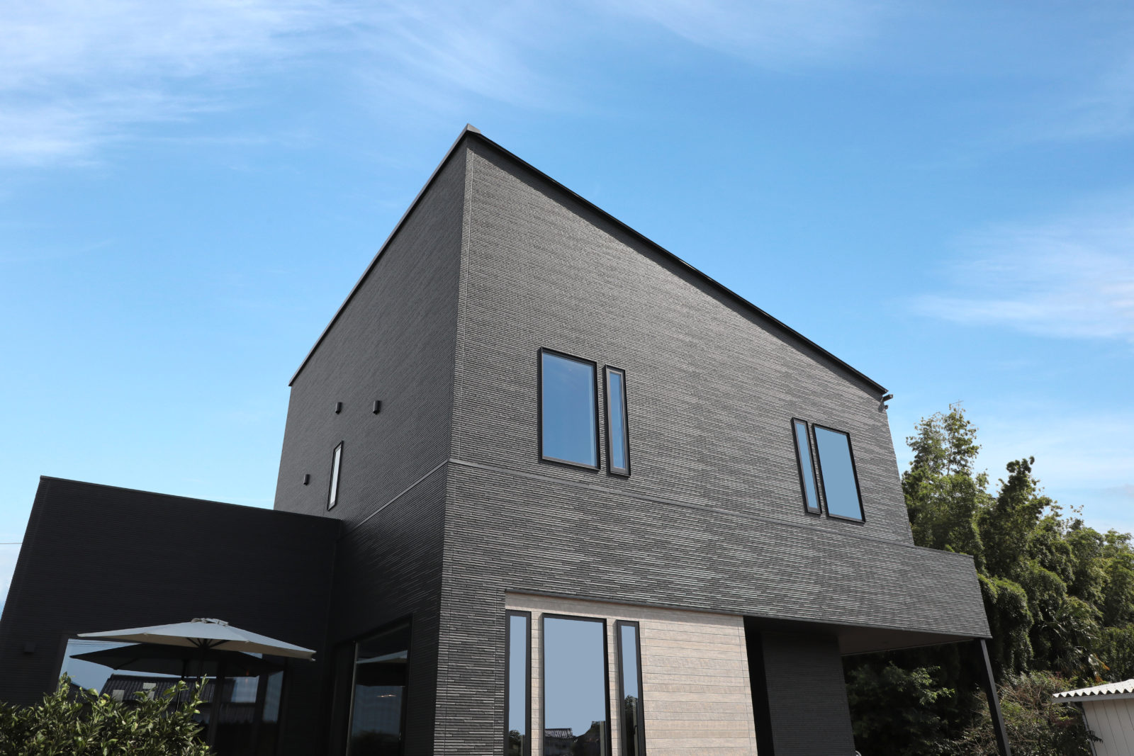 ガレージ箇所や本体外壁を立体的に飾り立てるレンガタイルを採用!