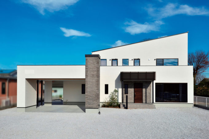 箱型の凸凹感と勾配屋根、ガレージを一体化した、