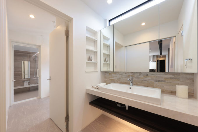 造作洗面台は、石張りと石目調でおしゃれに!