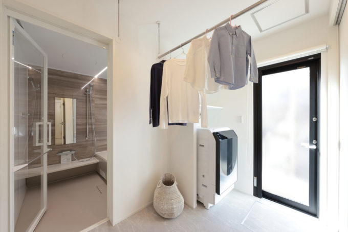 脱衣室には、広々とした収納もあるので