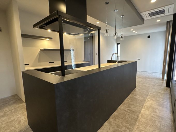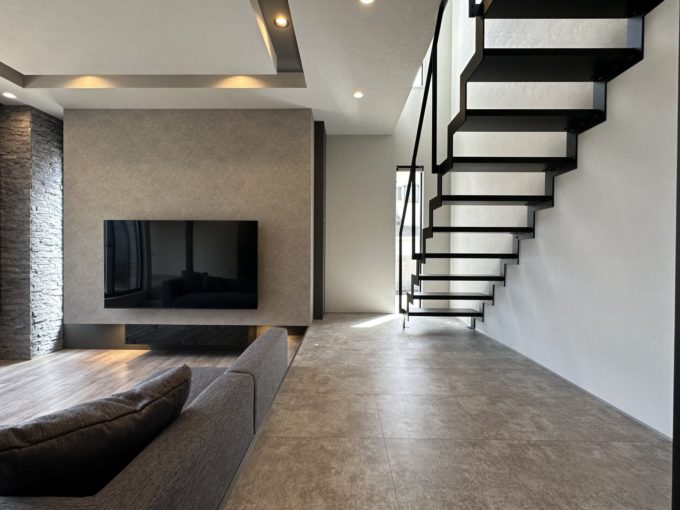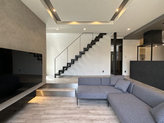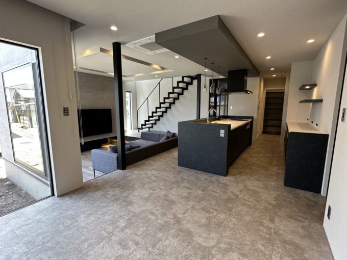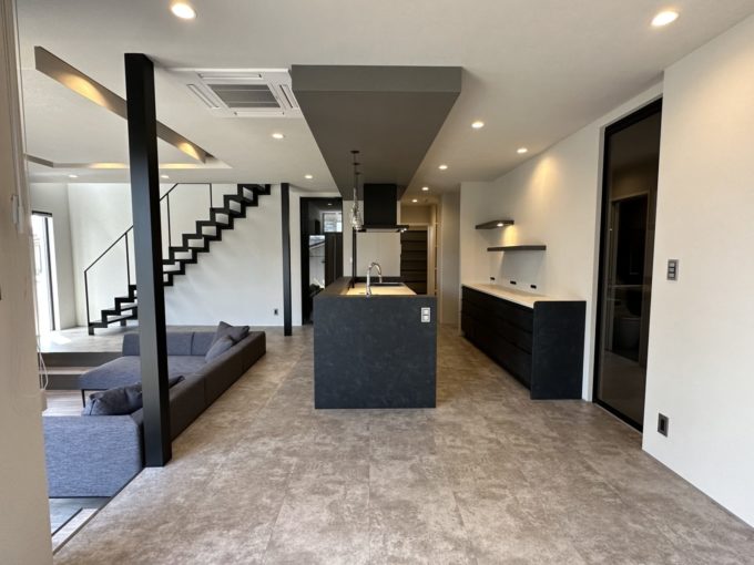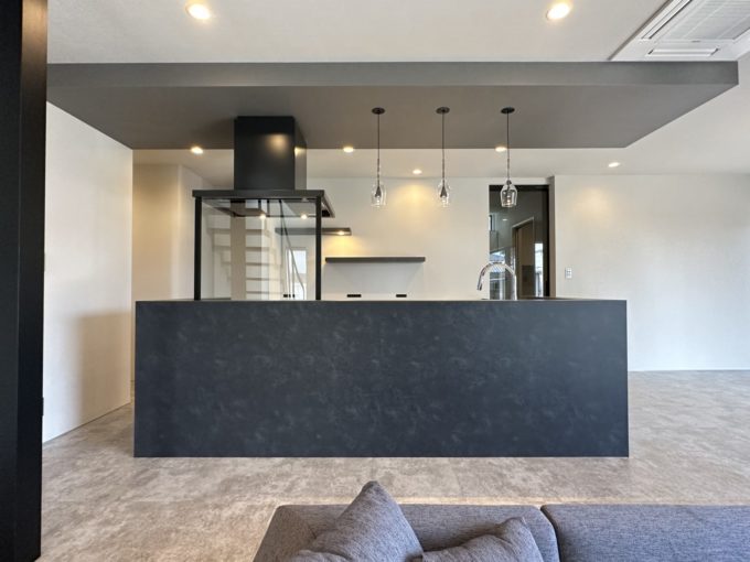 アイアンのブラックやキッチンの腰壁がアクセントとなり