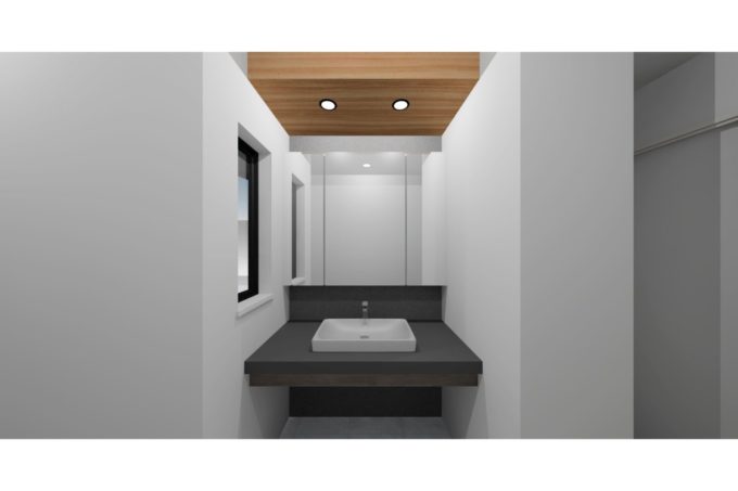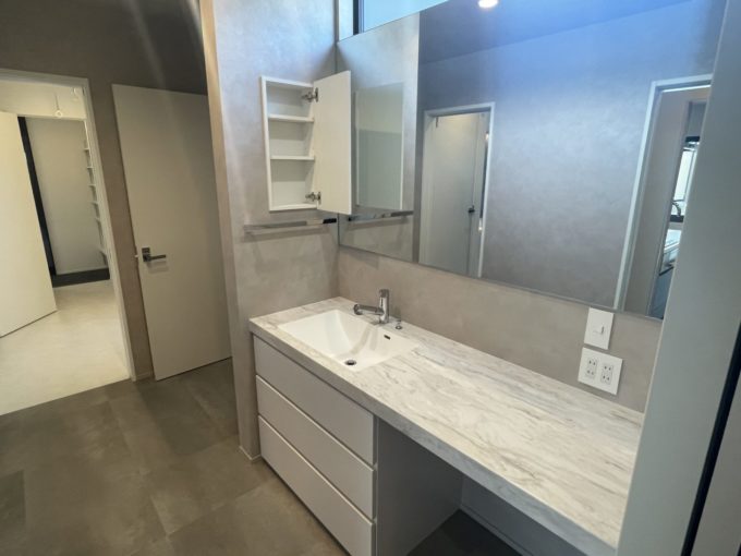 広々とした造作洗面台があり、左はトイレ→バスルーム→シューズクロークへと繋がり