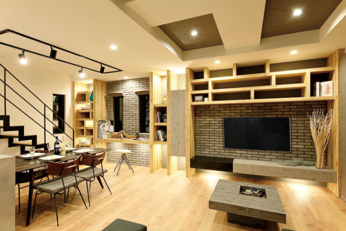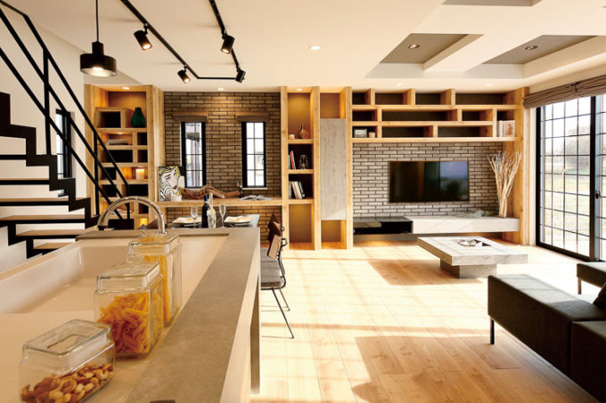 広々としたLDKに溶け込む本棚。本だけではなくディスプレイ棚や収納、ユーティリティーカウンターなど、趣味・癒し・利便性・演出など、様々な角度の考えをご夫婦の好みに合わせ表現。まさにセンスある暮らしを表現した空間と仕上がった。また、キッチンからの視野動線も大切な考え。昼は明るく開放的に。