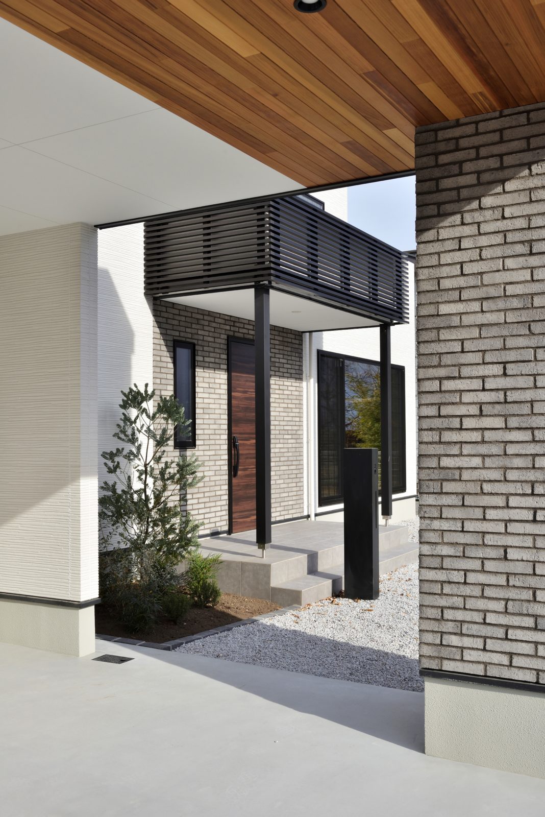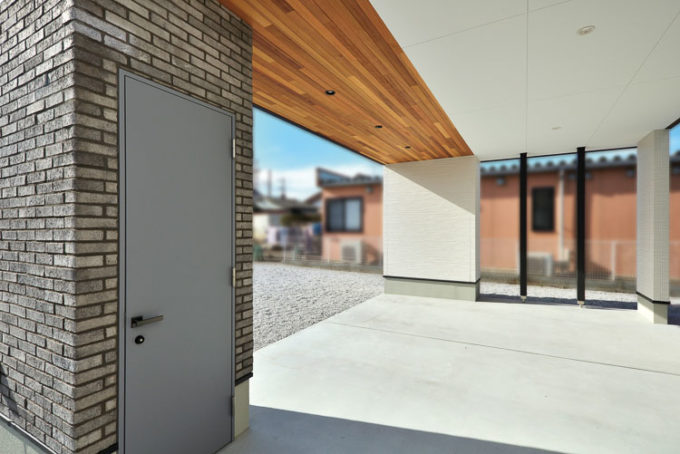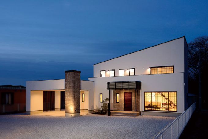 ガレージと片流れ屋根が印象的で迫力のある外観。決して圧迫感があるわけではなく、シンプルに・ナチュラルに・おしゃれにをバランス良く取り入れて、嫌味なくスッキリと仕上げた。また玄関前のグリーンや軒デザインが家族や客人をもてなす演出に。外部収納も外観デザインの邪魔にならぬよう、デザイン性と使い勝手の両方をセンス良くMIXした計画となった。