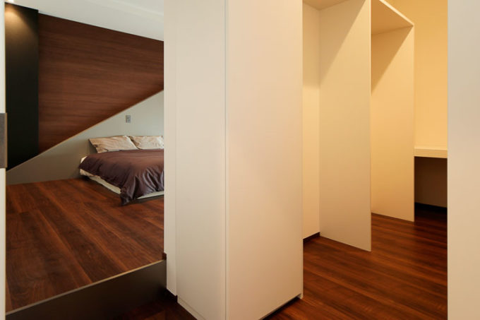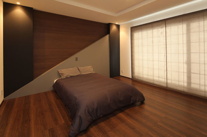 ベッドルームは小上がりになったアートを感じる落ち着きのある空間に。一日の疲れを癒やす、ココロ落ち着くカラーリングに。
