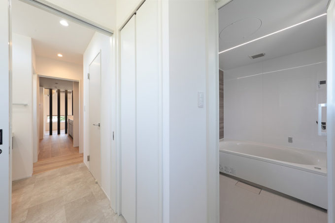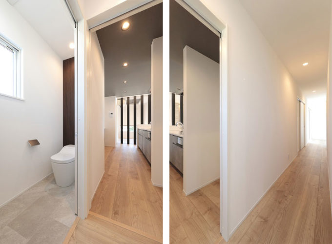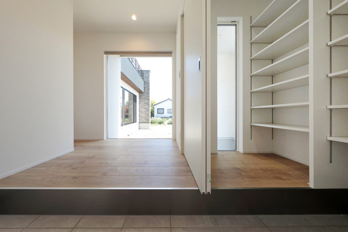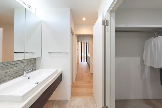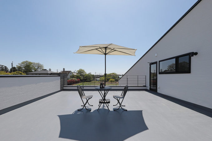 今回のテーマは半平屋。コスト、平屋の暮らし、デザイン×性能、家事動線などをSIBUSAWA流にバランス良く、センス良く設計デザインを行った。キッチンから始まる裏家事動線や洗面→ファミリークローゼット→主寝室へと繋がる動線も平屋的暮らしをテーマにしたSIBUSAWAらしい間取りとなった。まさに世の中が"家事動線を意識する以前"からSIBUSAWAが大切にしてきたオリジナルな発想アイデア。トレンドを意識しながらSIBUSAWAだからこそ分かる"本当の使い勝手"をセンス良くまとめ上げた計画となった。また、1Fリビング屋根スペースを大型バルコニーに。大パノラマビューを愉しむ大空間に。今後更にこの空間を創り上げ、セカンドリビングダイニングへと。暮らしながら創り上げる愉しみを家族の皆で…