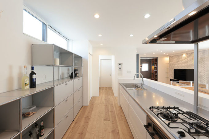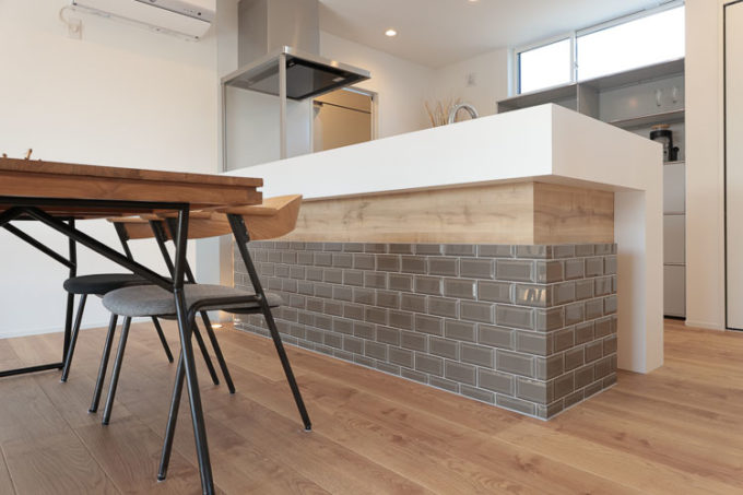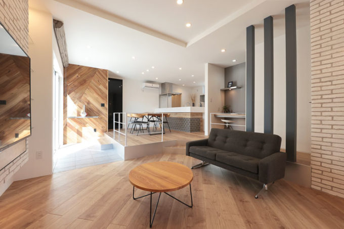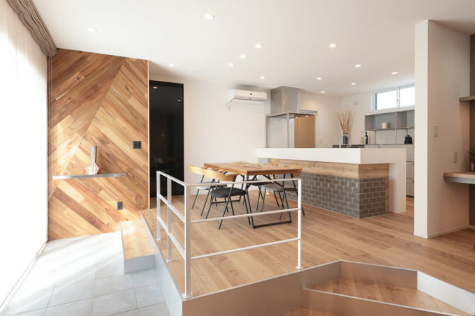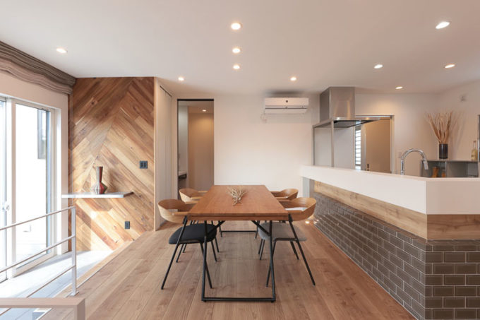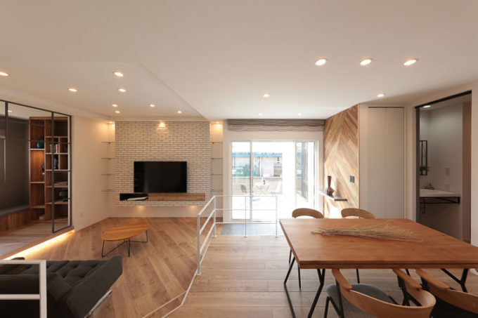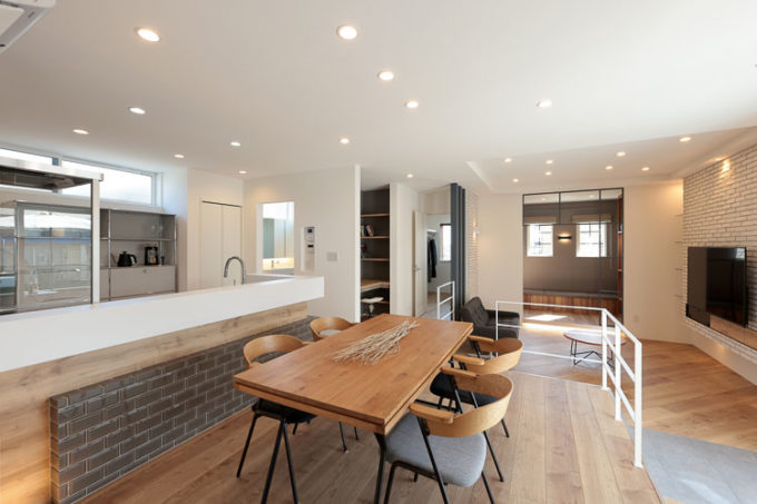 ダイニングキッチン廻りは、ナチュラルカフェモダンな空間に。SIBUSAWA-STYLEらしいジャンルMIX+空間設計デザイン。ダイニング→リビングゾーンへの動線も”あえて2WAY”に。また、床の段差をつけることで、空間のパーテーション的に感じ、ワンフロアでいて様々な要素が重なり合うLDKをデザインや空間要素が”散らかる”ことなく、センス良くバランス良くまとめ上げるPOINTとなった。ダイニング横の土間スペースも毎日の暮らしの動線を無意識に愉しむ縁側として、チェアを置けばカフェスペースとして…様々な使い方がある土間スペースも”さりげなく”設けた。