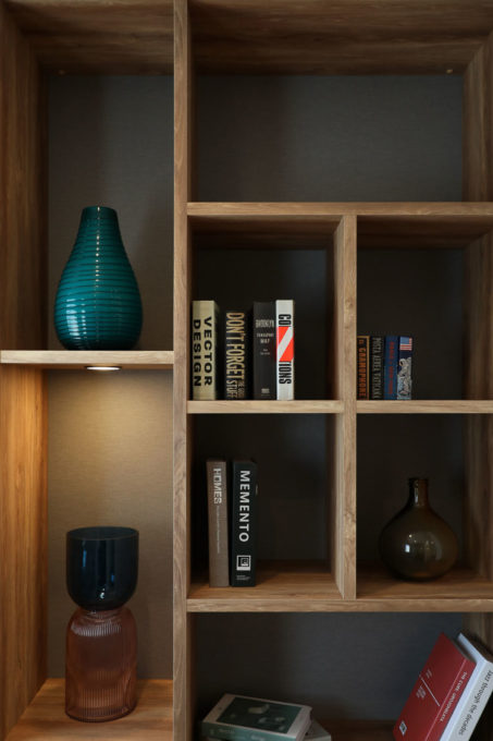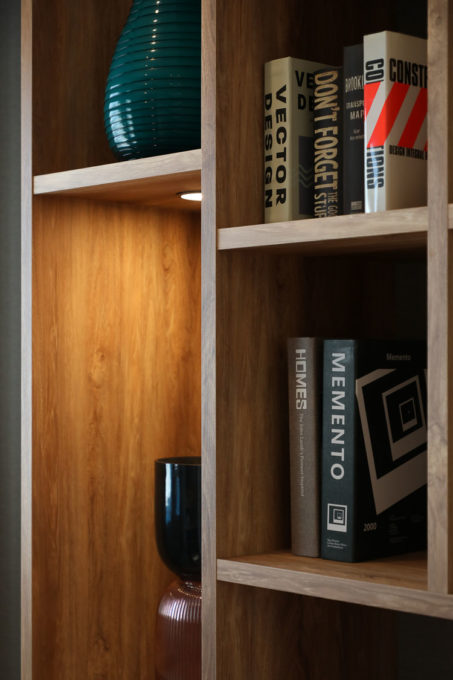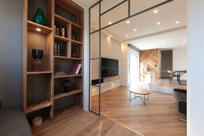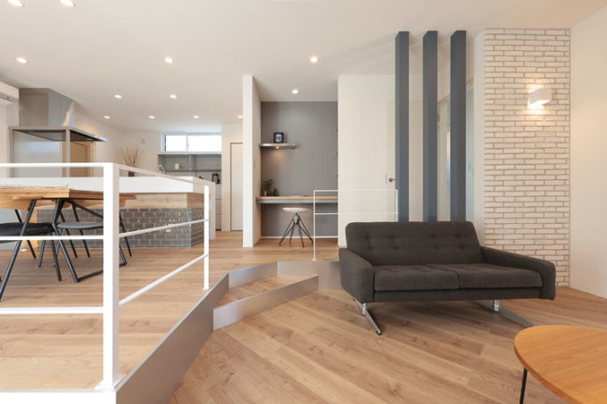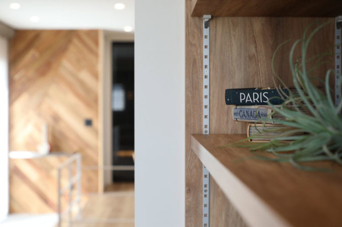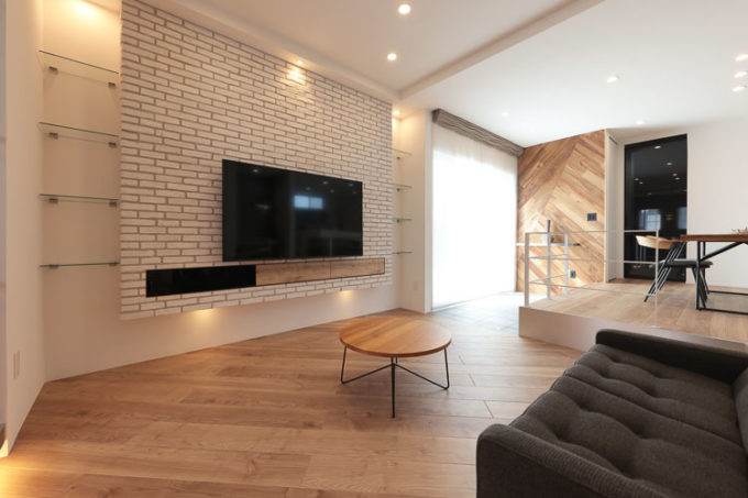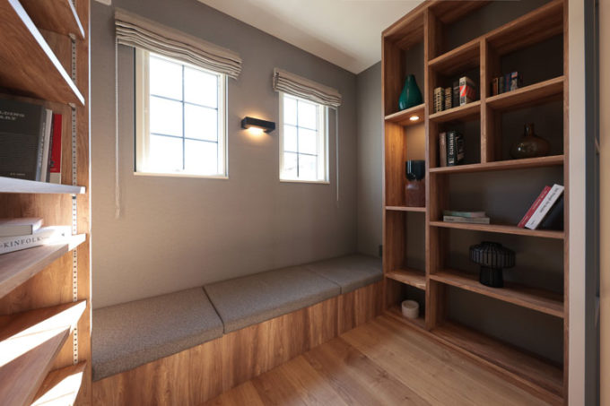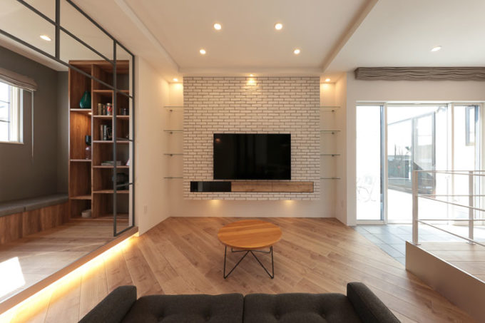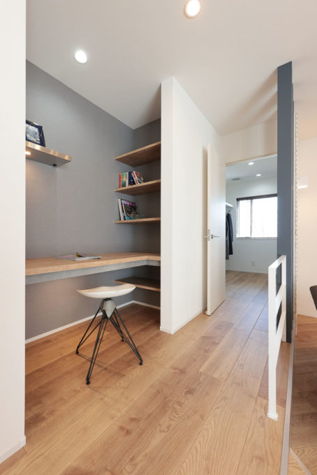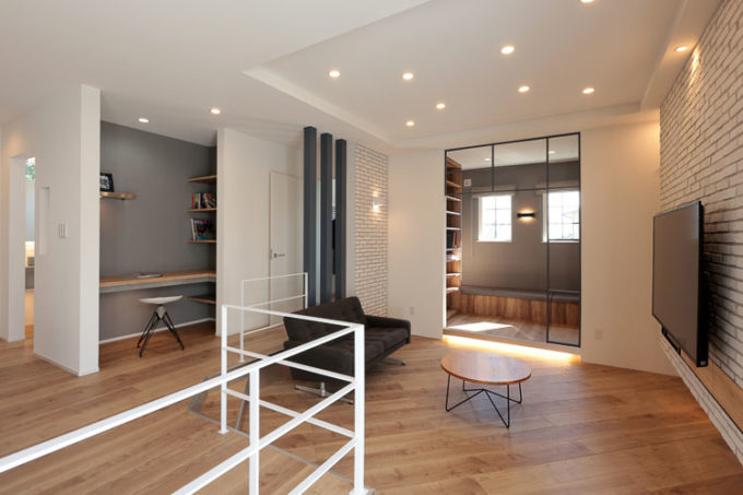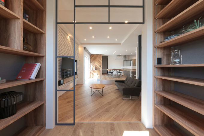 室内は、ナチュラルモダン・カフェ風・ホテルライクと様々なジャンルをSIBUSAWA-STYLEらしくMIXした室内空間に仕上げた。リビング空間は、デザイン性だけではなく、何気ない日常を愉しむユーティリティーなリビング設計に。読書が趣味である奥様の読書スペースをリビング隣に設けることにより、忙しい日常の中で、ほんの少しの時間でも、ゆっくりとできる日でも、さりげなく自然な動線で読書スペースに移動ができる大切な時間を”つくり”やすい配置とした。また、半こもりスペースで作り付けのソファーにゴロンと横になれば最高のお昼寝スペースにも。家族皆がそれぞれのタイミングで寛げるスペースに。そして、リビングソファー背面には書斎カウンター的なユーティリティーカウンターを設けた。忙しい旦那様のお仕事やお子様の勉強、奥様の趣味の時間など様々なシーンで使い勝手が良い、家族皆が使える便利なスペースに。家族皆が”繋がる”ことのできるリビング空間となった。