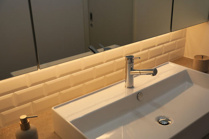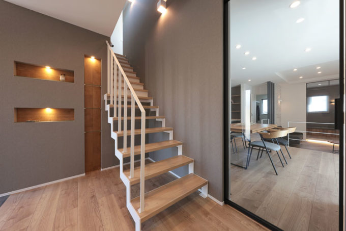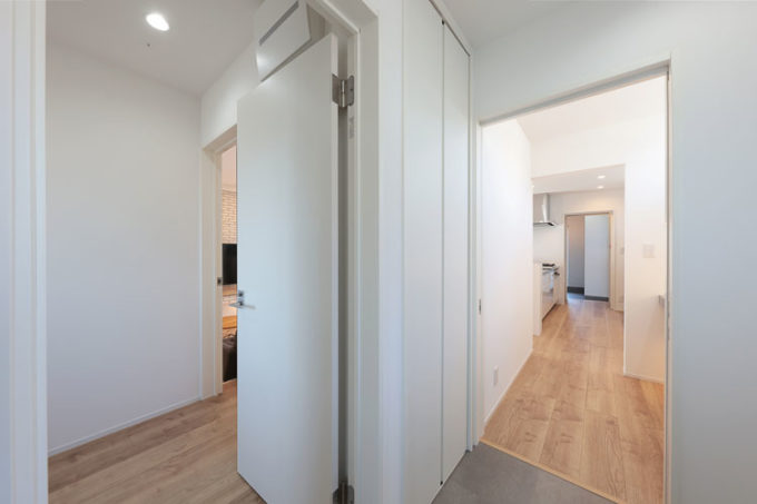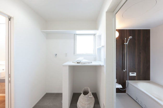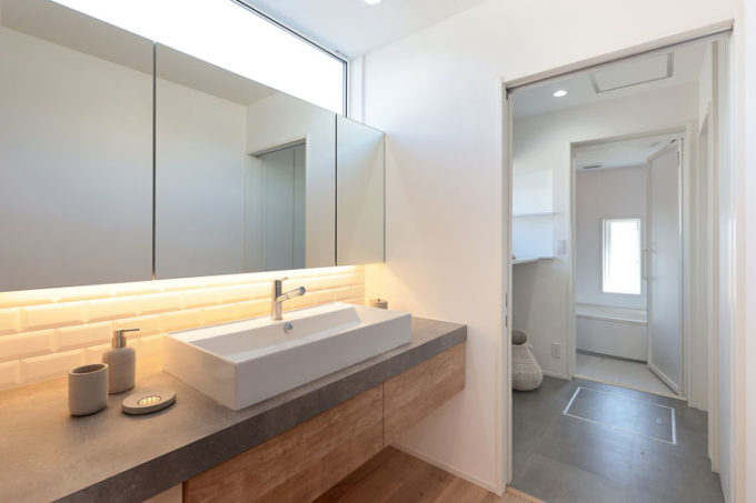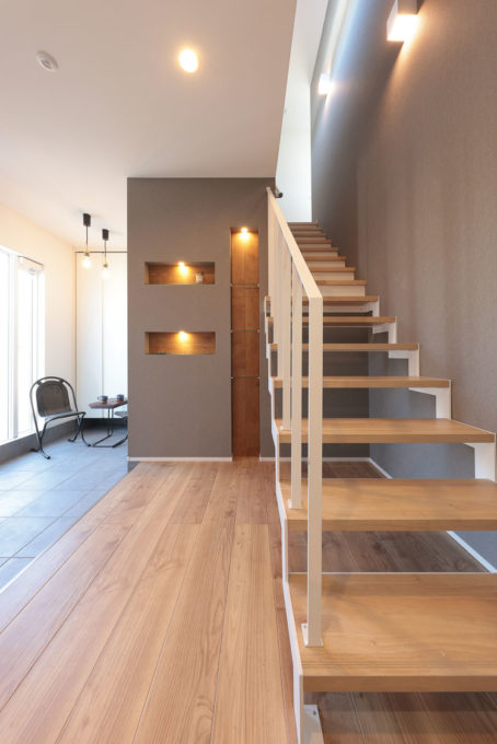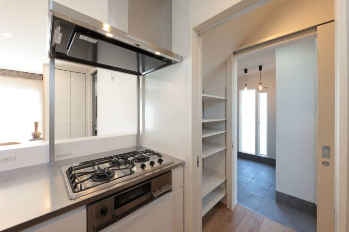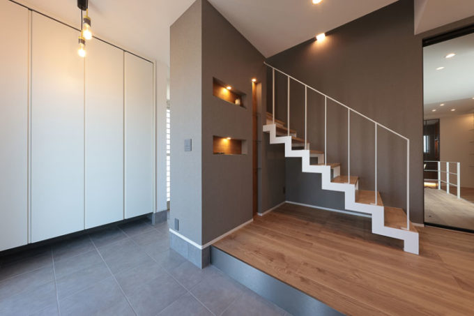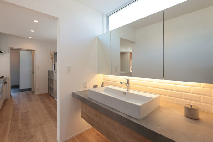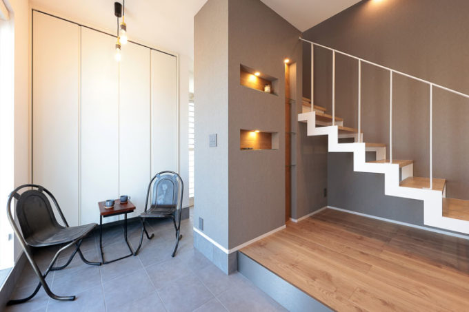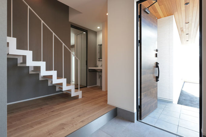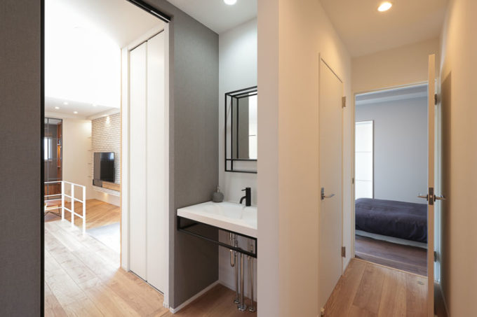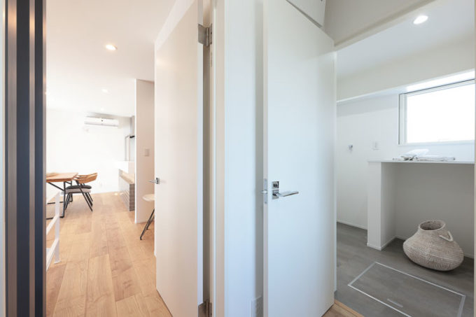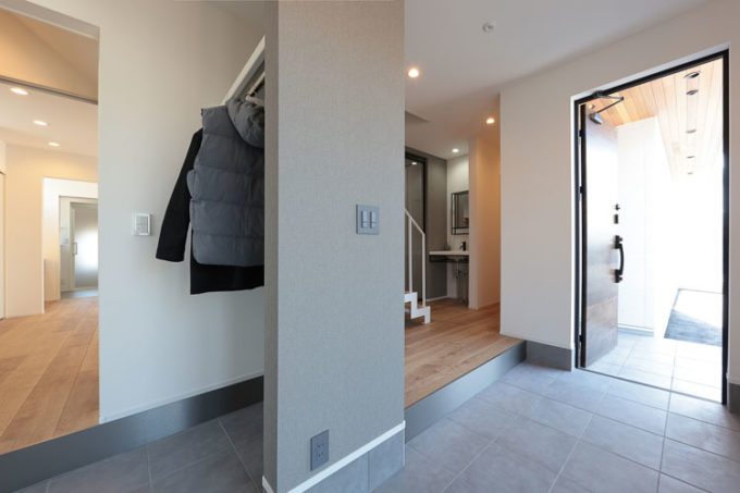 玄関から始まる帰宅動線。もてなす・愉しむを取り入れた玄関ホールもさりげなく、おしゃれにセンス良く。また、手を洗いリビングへorシューズクローク→パントリー→キッチンへと繋がる帰宅動線。玄関ホール先にベッドルームも設け半平屋的暮らしも。SIBUSAWA-STYLEらしい繋がる家事動線を今回もカタチにした。暮らしやすさがあってこそのセンスあるデザイン空間。SIBUSAWA-STYLEの大切にしている大きなひとつであり、常に皆様に表現し続けていることである。